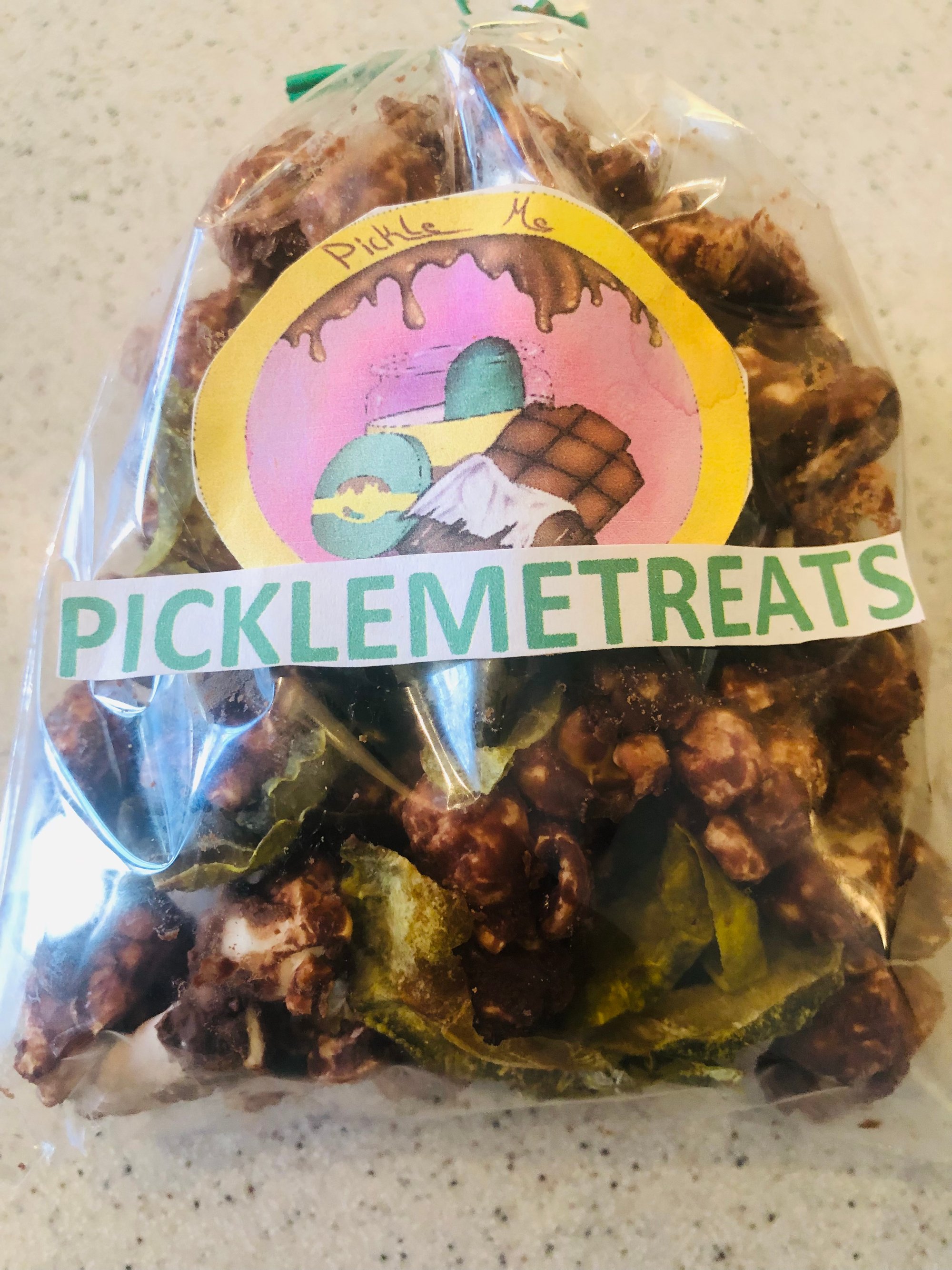 Poppin Flavor of Vegan Chocolate Covered Dill Pickle Flavored Popcorn With Dried Pickles.
